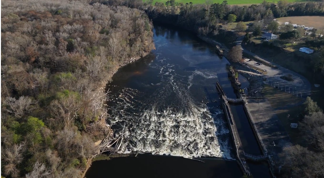 The Cape Fear River flows over Lock and Dam No. 1 at Riegelwood, N.C., on Jan. 18, 2025.