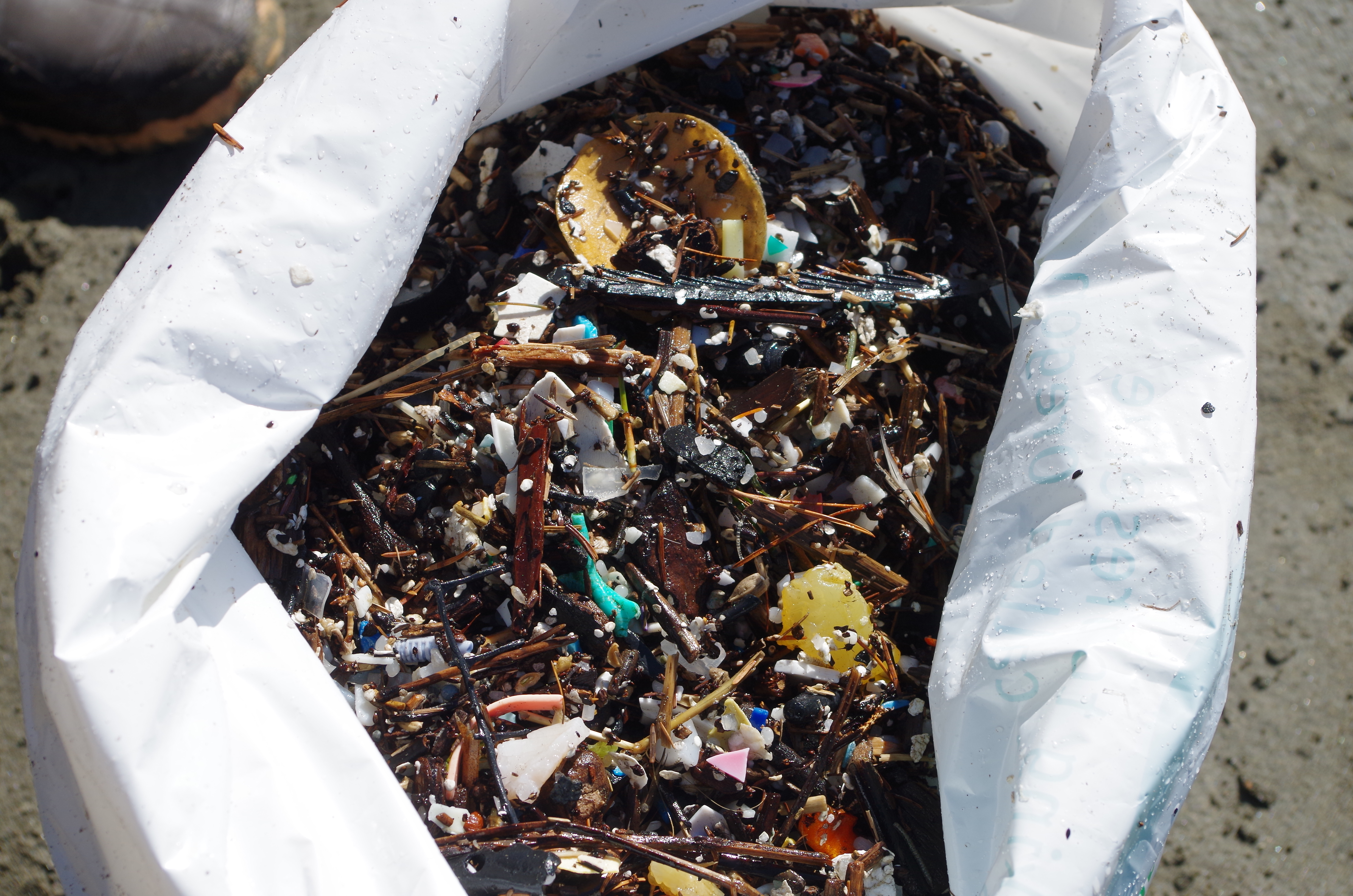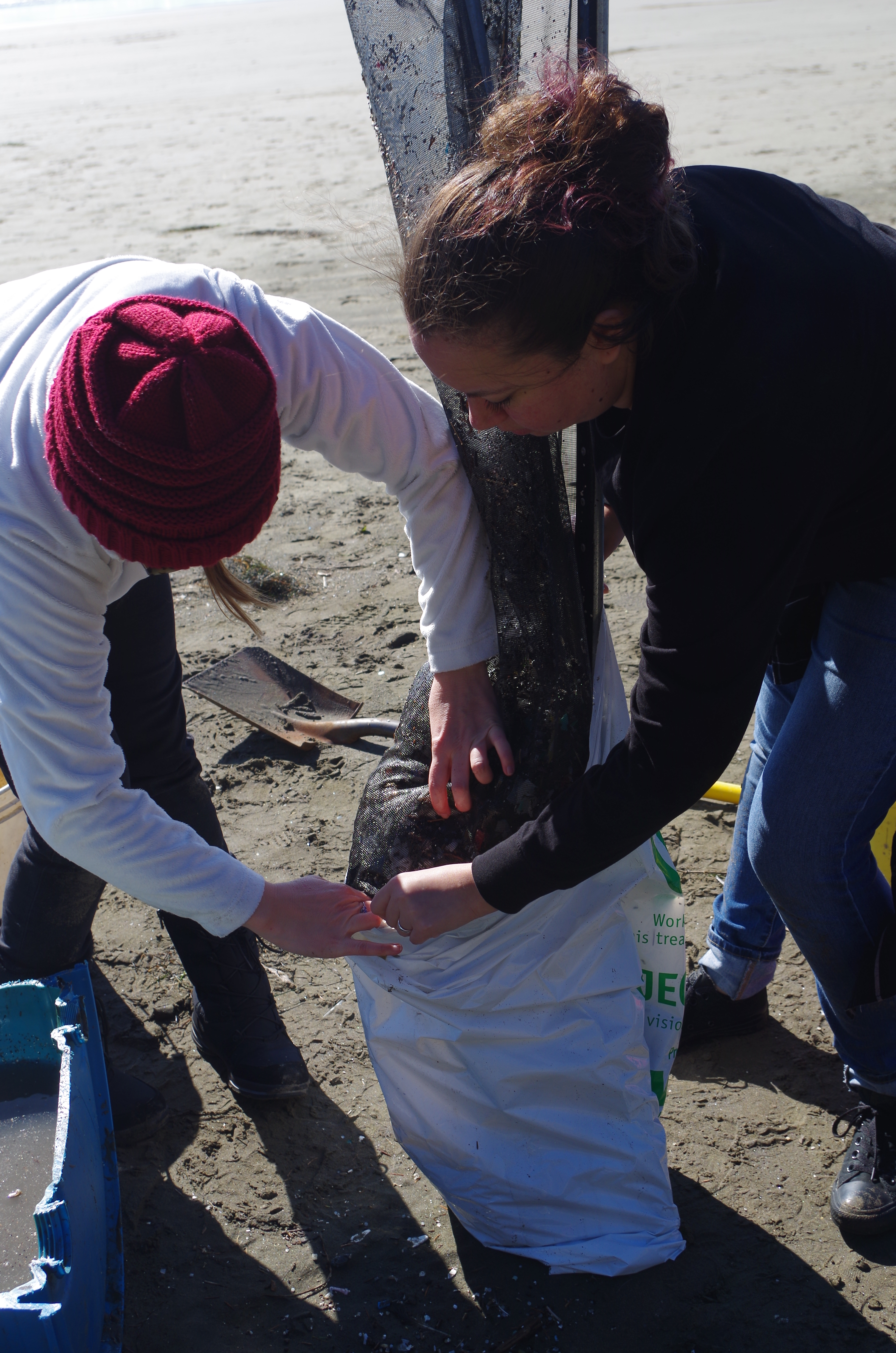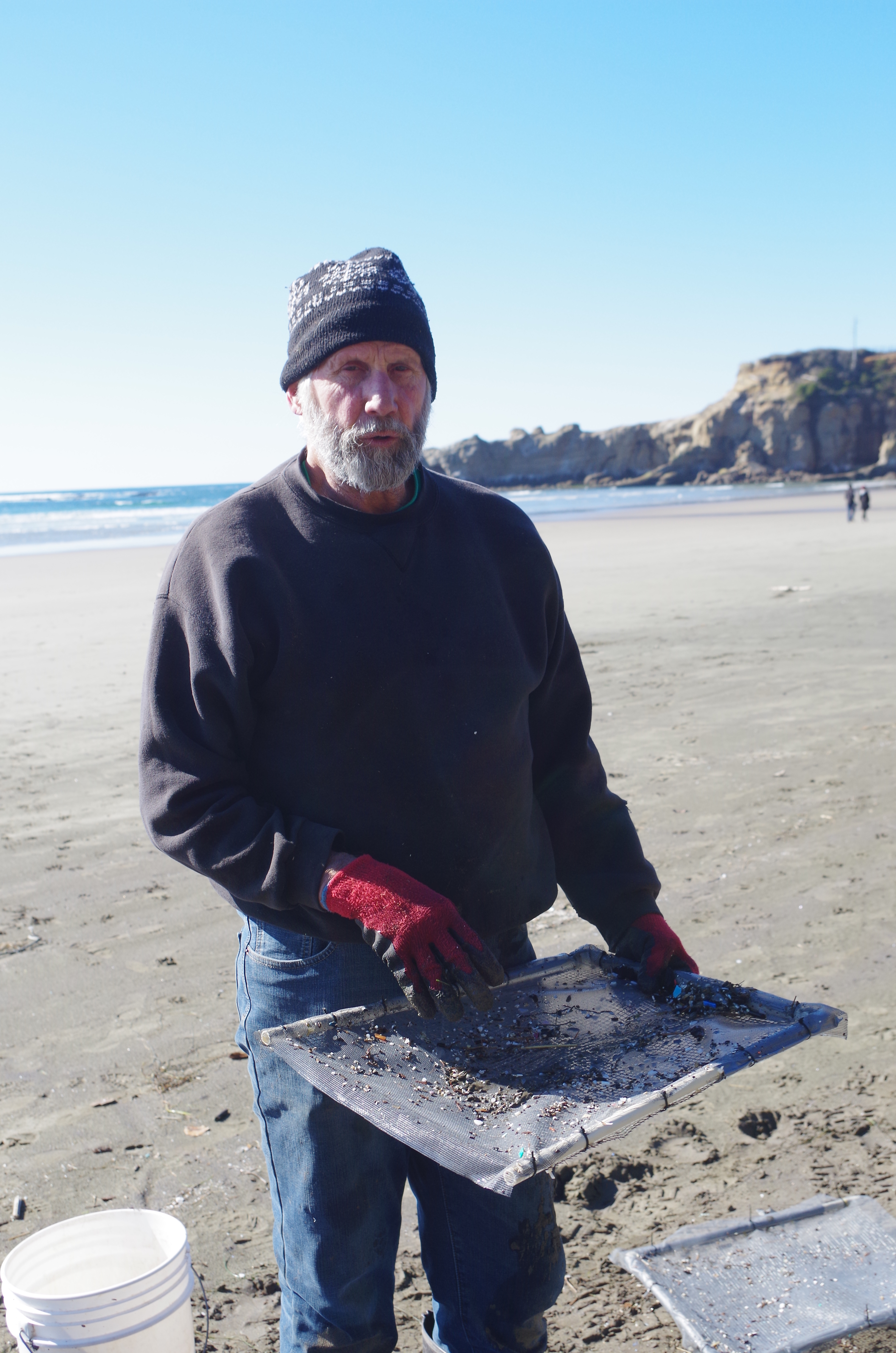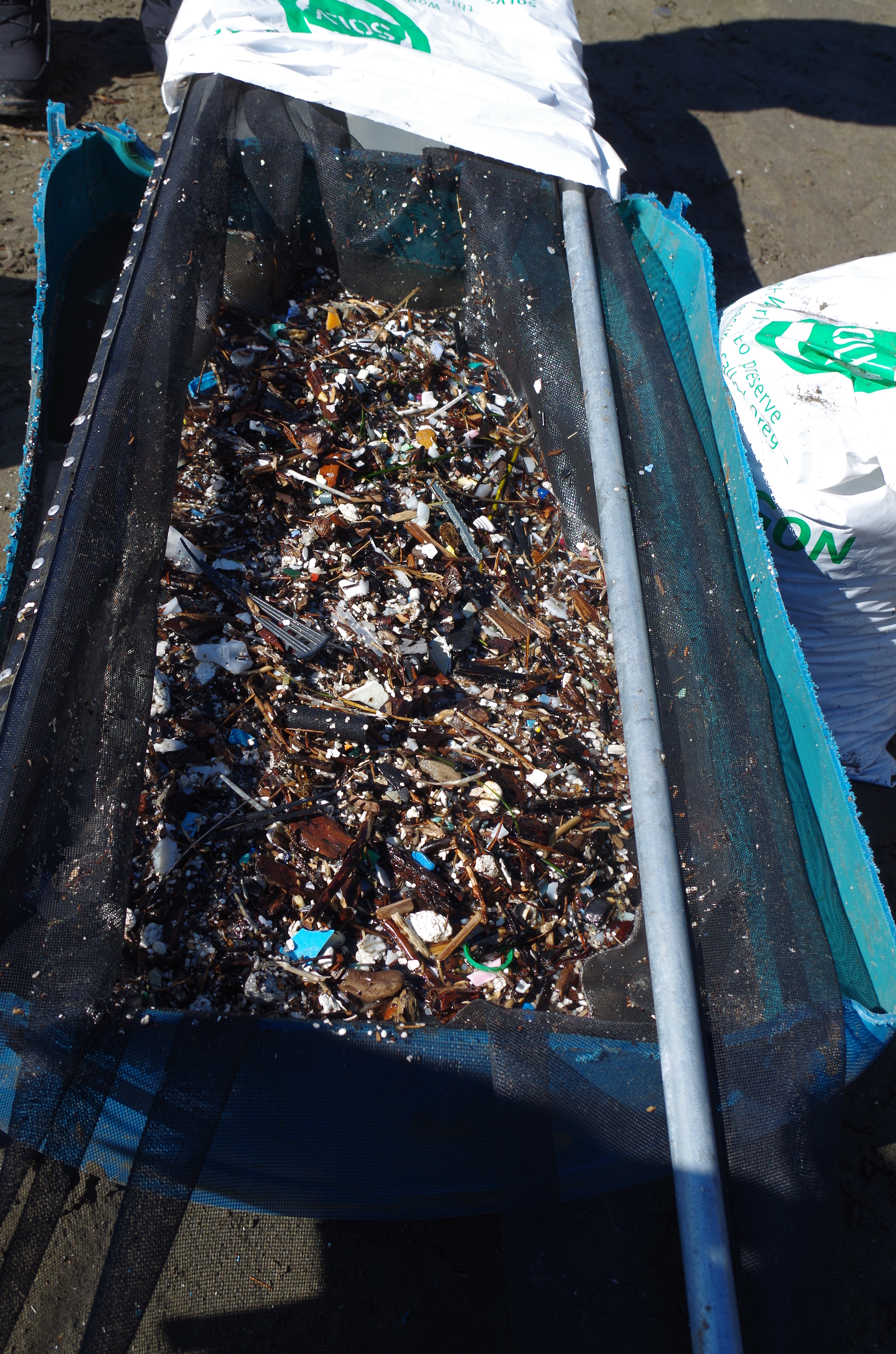 Piece by piece. Or, scoops of sand, with organic matter like shells pieces and driftwood and these microplastic and plastic nurdles plopped on a gurney-sized fine mesh, is akin to, what, using one household colander to strain the daily pasta and noodle intake in Oregon?