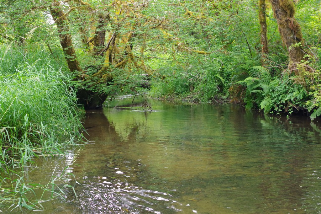 While the Alsea River is the mainstem of salmon runs, tributaries like Lobster Creek play a crucial role in salmon health. We are in an area known as Five Rivers, 25 miles east of Waldport. Alder, Cougar, Buck, Crab and Cherry creeks make up those five tributaries.