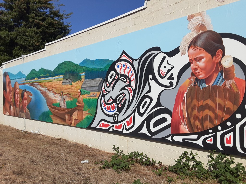 Again, the un-ceded lands of the Alse: We call the reservation, Confederated Tribes of Siletz Indians. The town I live in is not land that was purchased or rented from the tribe. We also are partially built on an Indian burial ground. Above this is the mural of “tribal” people, in Waldport, next to a beat-down but busy bar and grill. This is it for this town of 3,000, which is along Highway 101. and thousands of RVs and SUVs coming up and down this coastline looking for beach, food, beer, boating, crabbing and Air B & B living. No history of the tribe, and the fact the US government in 1855 “gave” the Siletz a million acres, which, of course, today, consists of 3,600 acres. Those squatters, those illegal aliens, you know them as the Oh Pioneers. Breaking the law of the land as soon as they hitched up oxen to wagons and headed to the Oregon Territory.
