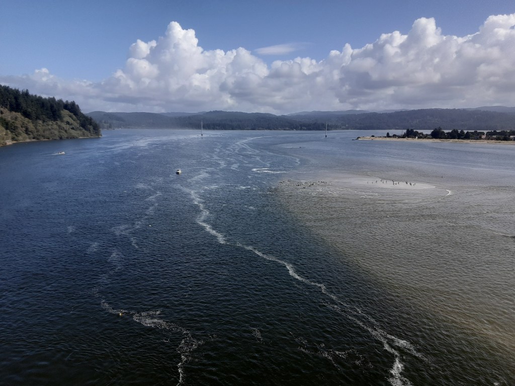 The image above the mural is from the Alsea Bay bridge, of the Alsea River running to the Pacific. Amazing sight, and, those are harbor seals there on the sand spit, and somewhere to the right, where I live.