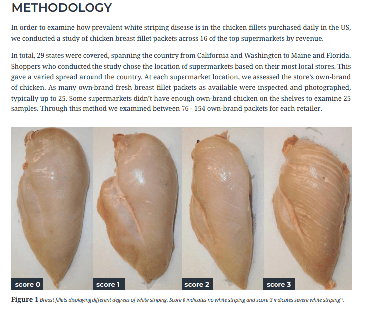 The Humane League report was dismissed as unscientific by the National Chicken Council, which likened white striping as similar to marbling in red meat.”