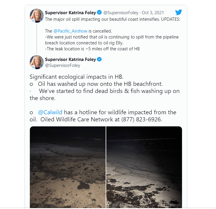 The oil continues to spill from the pipeline breach location connected to Platform Elly, Orange County Supervisor Katrina Foley tweeted early Sunday. She said the leak location is five miles off the Huntington Beach coast.