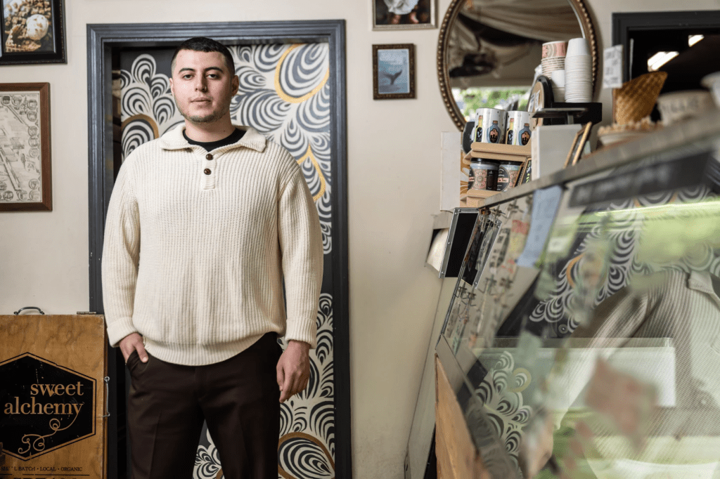 Here, one of the images in this story: Oscar Joya, here at the ice-cream shop where he’s worked since 2018, has dropped out of the U. of Washington twice.