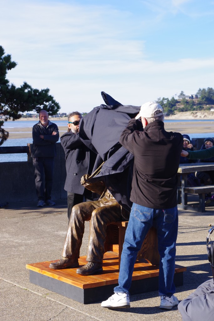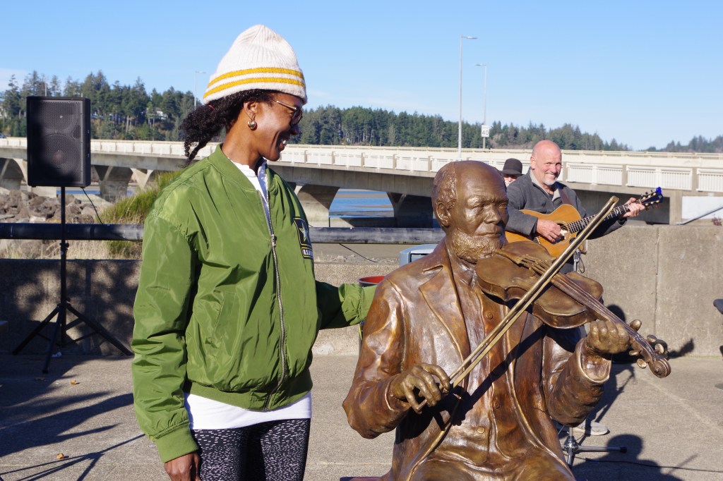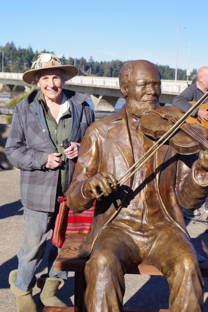 The celebration was lively: in the small town of Waldport, Oregon, a few hundred finally gathered to see the statue’s unveiling. We heard a Gulf Coast guy, Truman Price, a violinist, play music on his fiddle reminiscent of the tunes of 1880s which would have been played by the historical person cast in bronze. A sculptor showed up, Peter Helzer, and his daughter, too, who was on the banjo with Truman and another fellow playing guitar. The story is of a slave, brought to Oregon by his “owner,” James Southworth. Oh, those Oregon Black Exclusion laws initiated in 1844, stating that any Black individuals or families attempting to settle here would be whipped 39 times, and repeated until they left. The Oregon Constitution in 1859 made it illegal for African Americans to live in Oregon. That law was repeated in 1926.
