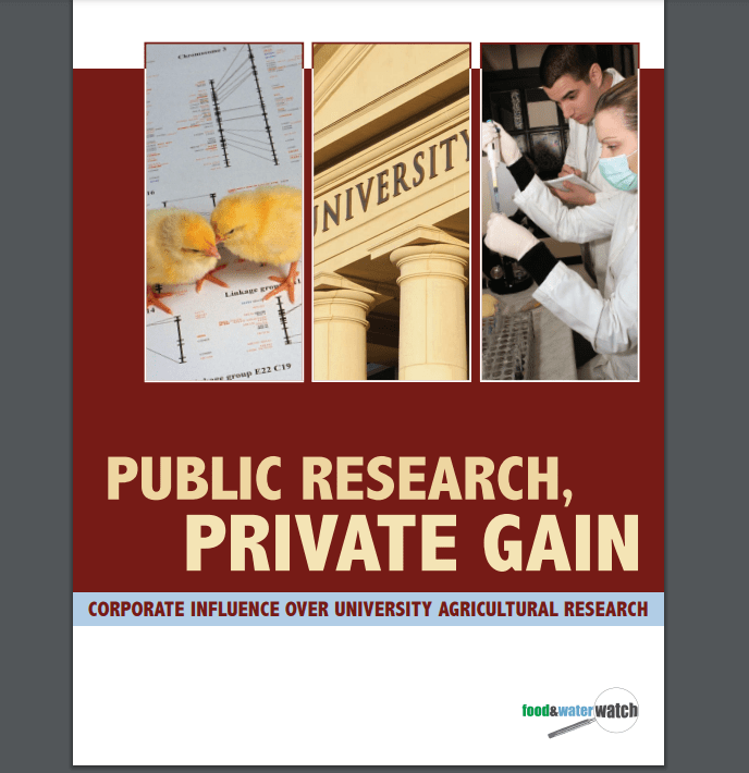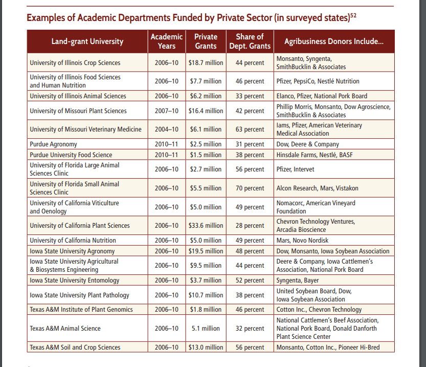 Indeed, the “voices of authority” — especially academic experts — receive the highest marks on trust, according to global surveys.[3] In this context, the growing private-sector influence over universities, and land grant institutions in particular, is concerning. From 1970 to 2014, public funding to land grant universities for agricultural research and development grew by just 20 percent, while private funding grew by 193 percent to $6.3 billion, according to an analysis from the Agricultural Policy Analysis Center.[4] Today, hundreds of millions of dollars flow from agribusiness, including pesticide companies, into land grant universities in the United States. This funding is used to sponsor buildings,[5] endow professorships and pay for research, according to an analysis from the public interest group Food and Water Watch.[6] “The influence this money purchases is enormous,” the Food and Water Watch analysis concluded. “Corporate money shifts the public research agenda toward the ambitions of the private sector, whose profit motivations are often at odds with the public good.”