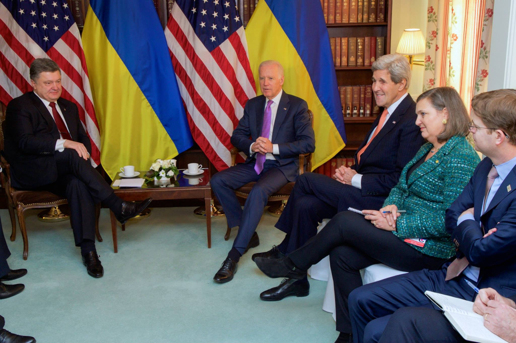 Ahh, the fed chief, or this cabal? Vice President Joe Biden, flanked by U.S. Secretary of State John Kerry and Assistant Secretary of State for European and Eurasian Affairs Toria Nuland, sits with Ukrainian President Petro Poroshenko on February 7, 2015, before a bilateral meeting on the sidelines of the Munich Security Conference in Munich, Germany.