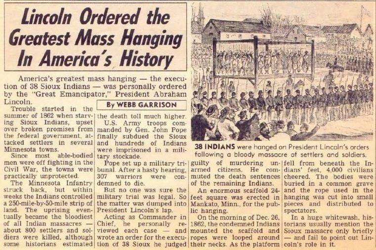 Thirty-eight Native Americans were hanged on Dec. 26, 1862, as ordered by former President Abraham Lincoln, after the 1862 Dakota War, which was also known as the Sioux Uprising of 1862. The sentences of 265 others were commuted.