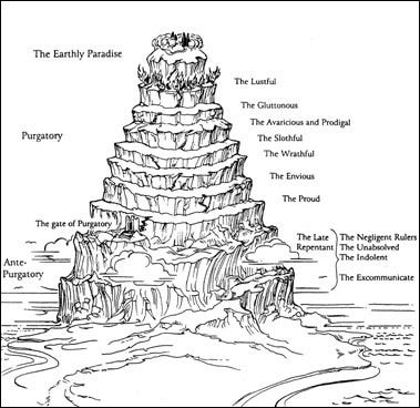 Like hell, purgatory also has a structure in which each level focuses on a different sin. Unlike hell, sinners in purgatory work their way up through the seven terraces of purgatory in order to finally reach heaven. To advance to a new terrace, sinners must first work off the sins from the previous terraces.