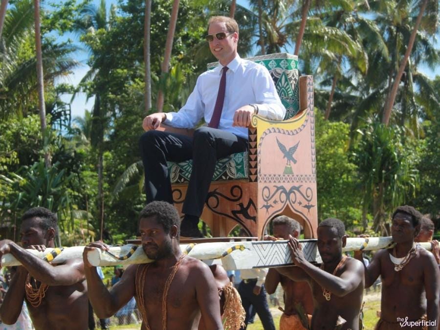 [Photo: “Prince” William, Tuvalu, 2012. It is difficult to imagine the humiliation these Tuvaluan men must have felt being subjected to further colonial exploitation/white imperialism that, rather than being eradicated in the 21st century, continues to expand.]