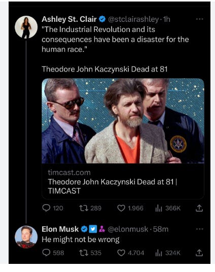 Kaczynski, who lived in a sparse cabin in Montana, explained his motivation for the killings as being rooted in hatred of the modern world and technology. This hatred has made Kaczynski a kind of folk hero for some people on both the far left and the far right, who see his worldview as fundamentally correct. But it’s certainly odd to see someone like Musk, who’s made his fortune selling the promise of futuristic technology, agree with the Unabomber on anything.