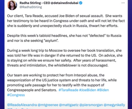 Former Senate aide Tara Reade and Radha Stirling, her attorney, talk about Reade’s accusation that President Biden sexually assaulted her in 1993, and why Reade is seeking Russian citizenship.