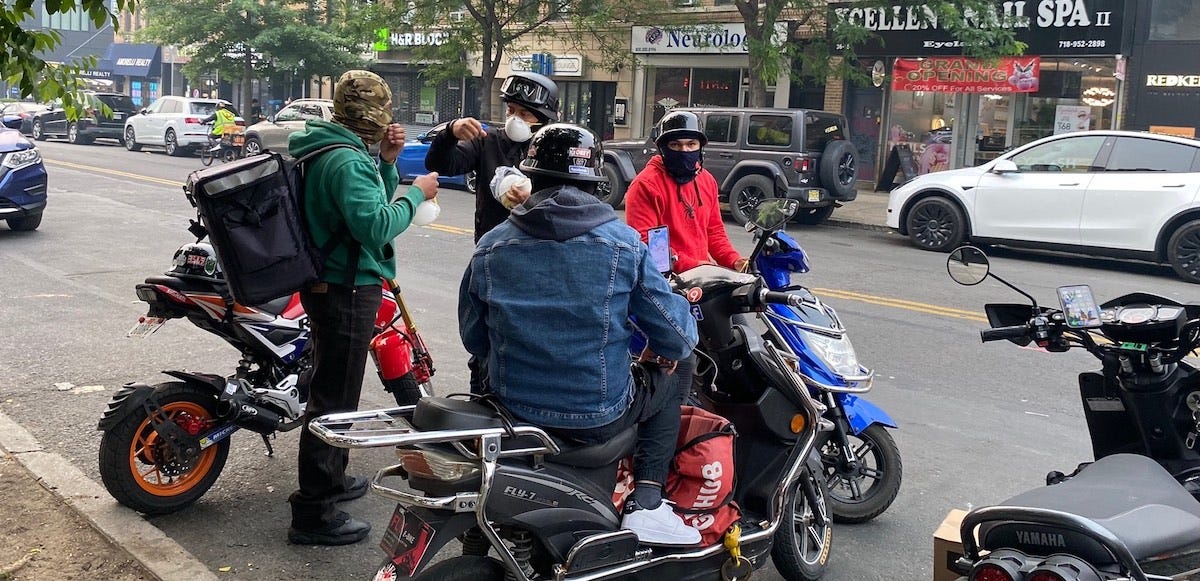 [Photo: Members of Los Deliveristas Unidos, a worker collective, distributed masks on Wednesday as smoke enveloped New York City. Photo: Luis Feliz Leon.]