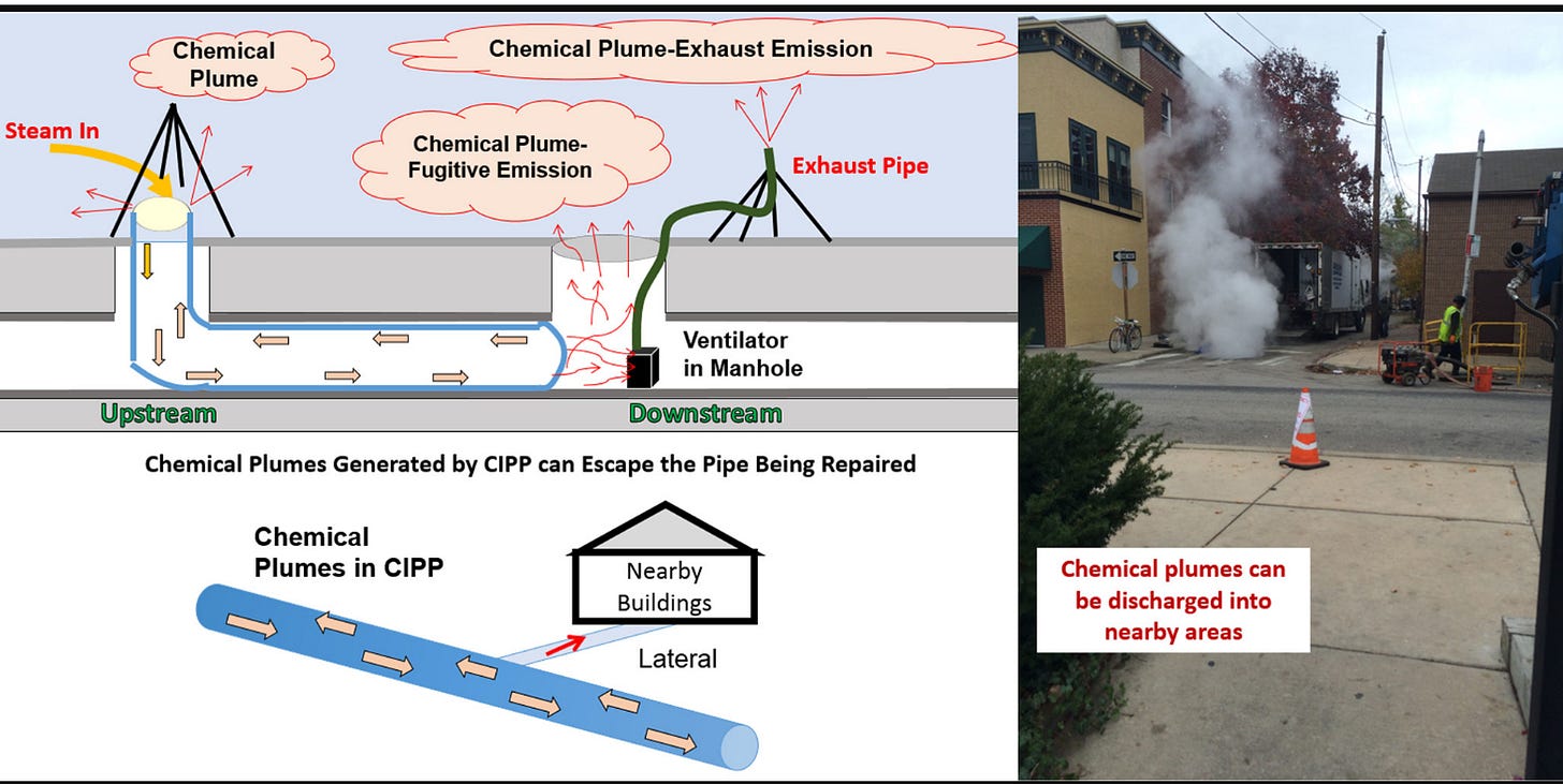 Little is known about CIPP worker exposures and health risks. CIPP manufacturing sites are highly transient, with a single installation location being used from a few hours to a few days. Unlike traditional manufacturing operations, there is not a ‘permanent address’ to visit or inspect. Once the construction process is complete, the workers and equipment move on. The CIPP manufacturing process can expose workers to raw chemicals, forced air, steam, hot water, ultraviolet (UV) light, materials created and released into the air during manufacture, as well as liquids and solids generated by the process and worker activities. To date, CIPP air monitoring studies have been unable to comprehensively characterize occupational exposures because of a narrow focus on VOC vapors and the use of nonspecific detectors. See below for information on the October 5th free webinar “Public Health Implications and Occupational Exposures during Water Pipe Repair Activities” (to view webinar, click here ). (source)
