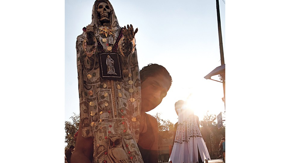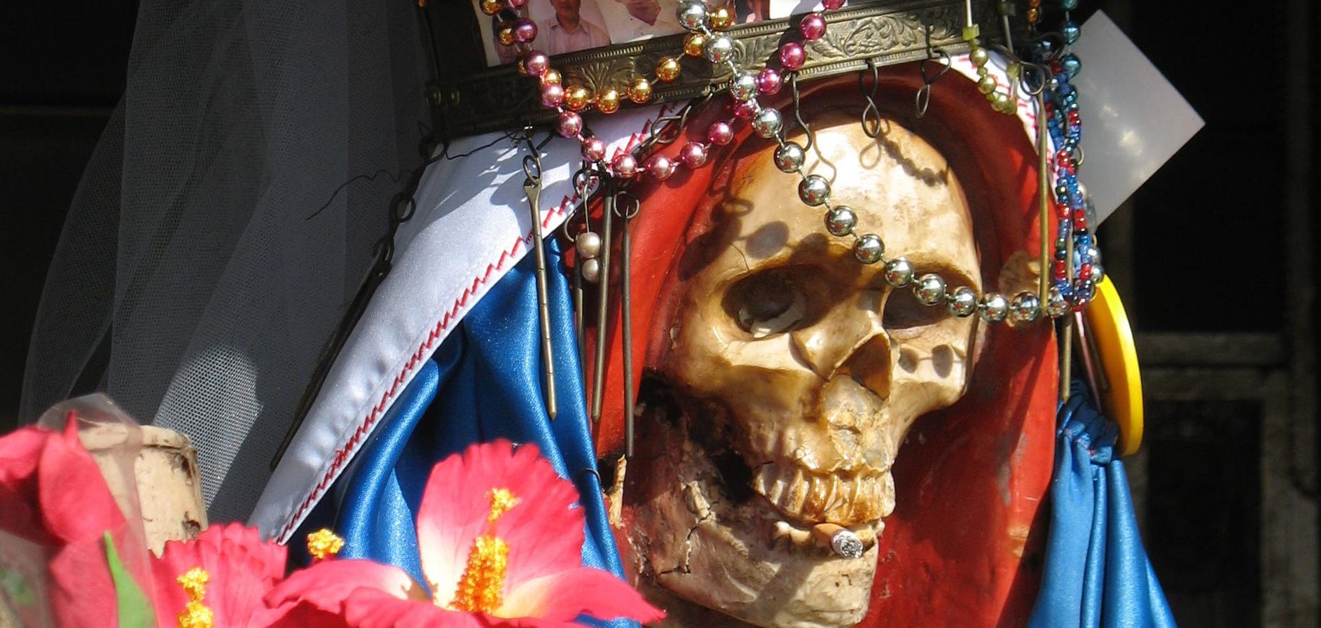 And yet, despite this condemnation, her flock is flourishing. Enriqueta Romero, an adherent so frequently interviewed by Mexican and foreign press that she’s become a sort of spokeswoman for the Santa Muerte movement, attributes this to the folk saint’s democratic nature: “She is fair and listens to everyone’s prayers.” According to Andrew Chesnut, a professor of religious studies at Virginia Commonwealth University, Mexican botánicas (esoterica shops) sell more Santa Muerte figurines than they do icons of the Virgin of Guadalupe, Mexico’s patron saint. “She has a reputation for being an incredibly speedy and efficacious miracle worker,” says Chesnut, describing her as a healer and a whiz at solving legal problems. “And unlike most canonized saints, at the end of the day, she isn’t Catholic, so you can ask her for anything—to bless a shipment of crystal meth, for example.” (source)