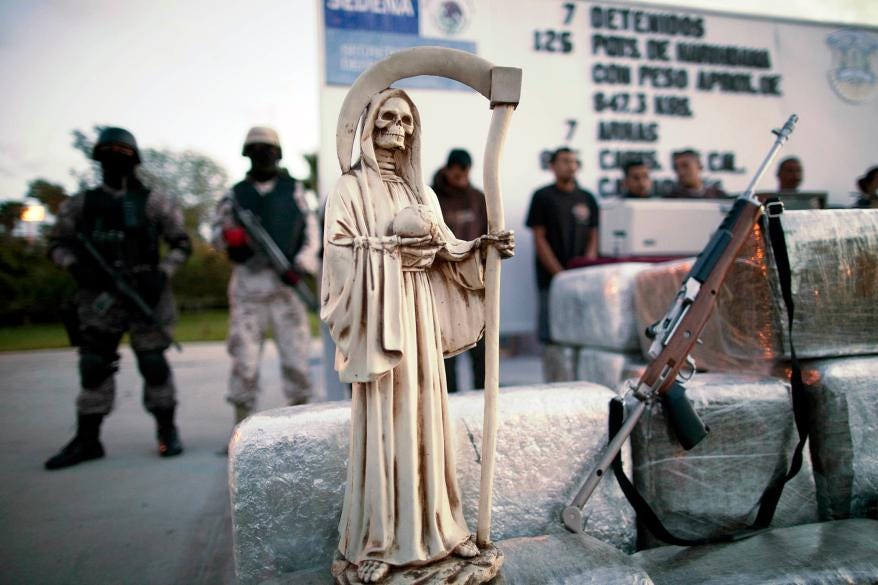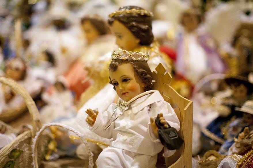 [Photo: Nino de Atocha: The Holy Infant of Atocha, who has roots in 13th-century Spain, is the patron saint of prisoners and travelers– and popular among drug traffickers. Medellin cartel leader Pablo Escobar had altars in many of his safe houses dedicated to the nino (who allegedly appeared to Christian prisoners as a boy who brought them food and water) and made a pilgrimage to Spain to visit the shrine. Mexican drug lord Ovidio Guzman, a son of Joaquin “El Chapo” Guzman, was wearing an amulet of the saint around his neck when he was briefly detained by Mexican authorities in 2019.]