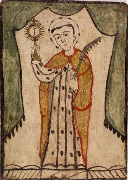 [Image: San Ramon: In 12th-century Spain, San Ramon was ripped from his mother’s womb after she died in childbirth. He later entered the order of Mercedarian Fathers, who dedicated their lives to freeing Christian captives that had been imprisoned by Muslim conquerors in North Africa. When he could not buy their freedom, he offered himself in exchange for several Christians — taking advantage of the situation to preach the Christian gospel. But his Muslim captors placed a padlock on his mouth so that he could not speak. Drug traffickers often place a coin on the face of his effigy when they pray to him to keep people quiet.]