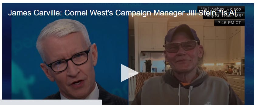 Former Clinton strategist James Carville warns voters not to “fall for” the Green Party candidacy of Cornel West, noting that his campaign manager Jill Stein is “almost certainly an agent of the Russian government.”
