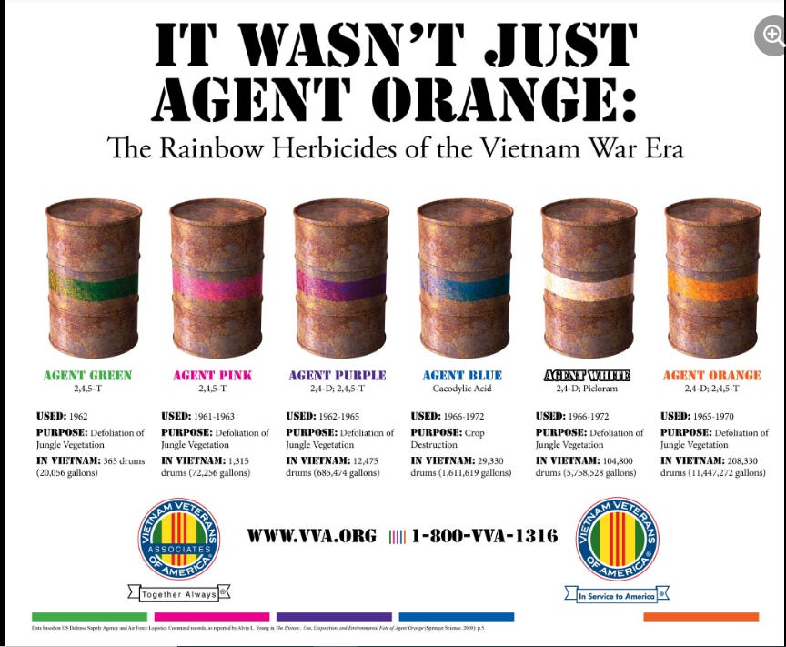 Six Rainbow herbicides, commonly called Agent Orange, Agent Green, Agent Pink, Agent Purple, Agent White, and Agent Blue, were sprayed on wetlands, rice paddies, forests, mangroves, bamboo and military base perimeter fences to defoliate jungle vegetation, reveal guerilla hiding places and destroy the food supply of enemy troops. South Vietnamese farmers, U.S. and Republic of Vietnam military personnel, and communist insurgents were exposed to these herbicides with immediate and longer term impacts on personal health, civilian household food security and population-wide famine.