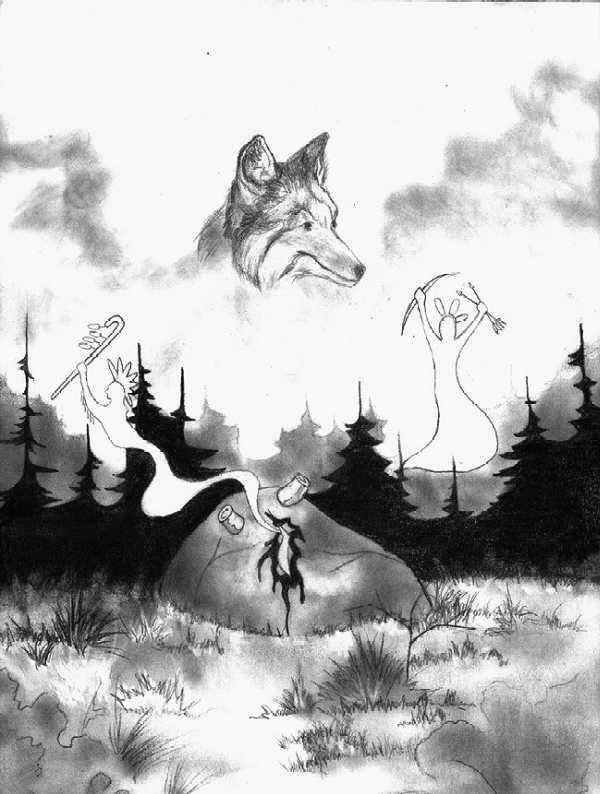When all was over and the captives at liberty there stood in the silence only the Coyote and his friend the fox. What should be done with this great body. They finally decided to cut it up in pieces and from the pieces people the world. So the Black Feet Indians were made from the feet – the Crows and Flat Heads from the head. The other tribes were made from the other parts and sent off to their own lands. The two friends were left alone. The fox looking up and down the river said Why no people are made for this lovely valley. And nothing left to make them now! True said the Coyote nothing but a few drops of the hearts best blood left on my hands. Bring me some water from the river. This was done, while the Coyote washed his hands he sprinkled the blood and water. And Lo the noble Nez Perce sprang up!