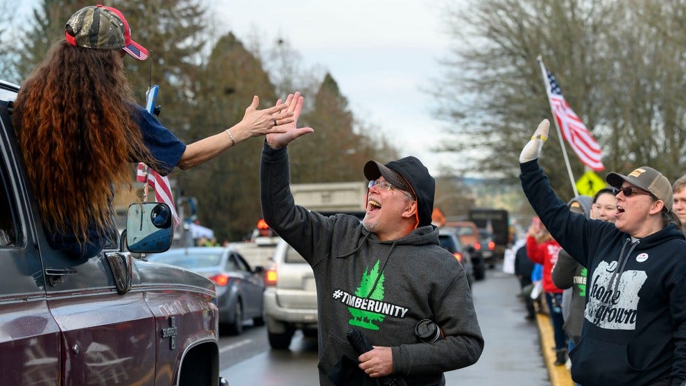 “While Timber Unity has sought to downplay these links, an investigation of its social media channels has found extensive ties between its leaders and Far Right figures, as well as the use of racist, homophobic, Islamophobic, and violent rhetoric by its supporters,” explained Spencer Sunshine, a sociologist who researches right-wing extremists, in a report he compiled for Oregon environmental groups. “The organization already has a history of and association with groups who have either made violent political threats or have supported violent actions.” — “The Oregon GOP’s Favorite Anti-Environment Group Is Awash in Racism and Violent Threats”