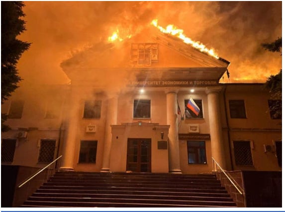 Are we going to get all those Russians, all those people in Donbass, all of us supporting the right of the Russian Ukrainians to live, a free 10-session with a couch and PhD head shrinker? [Photo: Donetsk University of Economics and Trade, following Ukrainian shelling on August 6, 2023.]