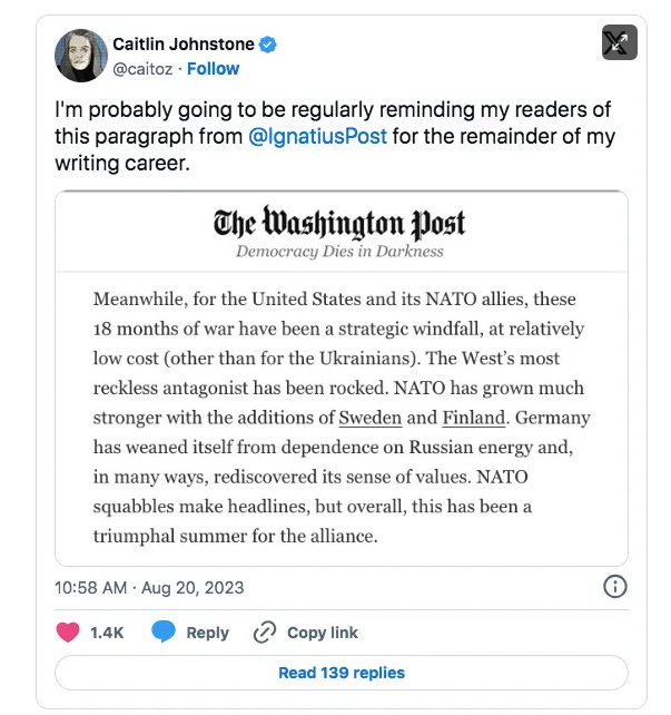 Meanwhile US officials openly gloat all the time about how much this war is serving US interests, while anonymously whining to the press that the counteroffensive is failing because Ukrainians are too cowardly to charge through Russian minefields under heavy artillery fire. This should draw white hot rage from everybody.