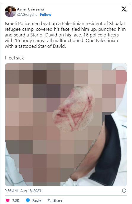 “This is literally what it looks like when the state runs on Jewish supremacy, cops knowing they will be celebrated and not held accountable torture prisoners by branding their faces with a star of David,” Yousef Munayyer, the former executive director of the US Campaign for Palestinian Rights, said via a tweet.