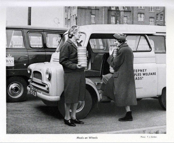 As an historical aside, the Meals on Wheels program started during World War Two, in London, as the so-called “blitz” crumbled people’s homes and disenabled them from preparing and cooking meals.