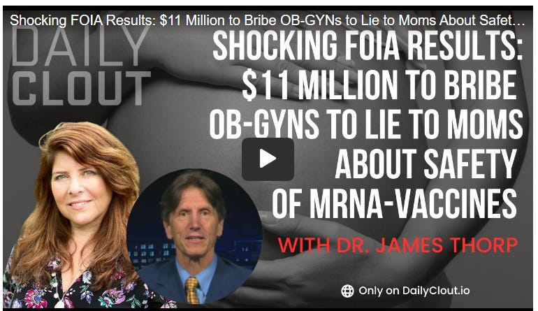 In this interview, Dr Thorp describes how he was unceremoniously if not injuriously fired by his health system employer – though he was among the most published of his colleagues. He described the results of a FOIA launched by his wife, attorney Maggie Thorp, and himself, that revealed $13 billion in funding to “influencers” to promote the mRNA injections, including surfacing a contract with a for-profit OB/GYN NGO that oversees tens of thousands of obstetricians and gynecologists on two continents. The contract that the Thorps’ FOIA disclosed, provides for the return of the money if medical organizations do not adhere to the “safe and effective” for pregnant women and new moms script presented to them by HHS. Dt Thorp independently confirms the WarRoom/DailyClout’s findings now from three other independent sources: that placentas, fetuses and newborns are being damaged by the mRNA injection. All four sources confirm the same kinds of damage: fibrins, blood clots, “small for dates” restricted growth and weight of the placentas, and calcifications. Meaning that babies of vaccinated moms in utero may not be getting enough food, and they may lack the room to grow normally.