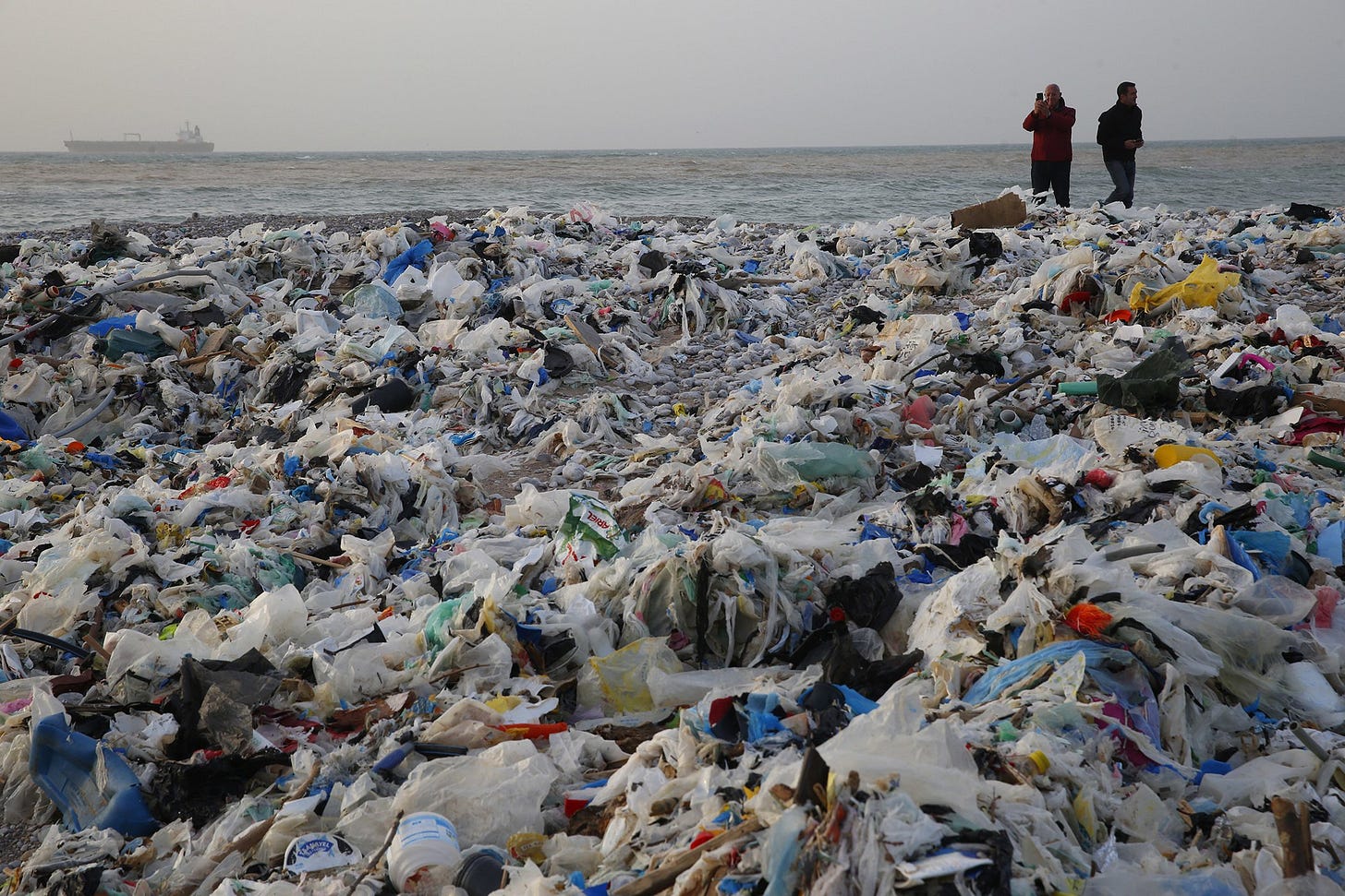 [Photo: A man takes photos of piles of garbage washed on shore at the Zouq Mosbeh costal town, Lebanon, Jan. 22, 2018. Environmentalists say a winter storm has pushed a wave of trash onto the Lebanese shore, stirring outrage over a waste management crisis that has choked the country since 2015. Image: Hussein Malla/AP]