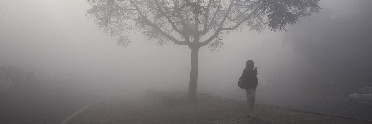 A fucking crime: [Photo: A commuter waits for transport on a road enveloped by smog early morning in New Delhi, India, Jan. 1, 2019. | A commuter waits for transport on a road enveloped by smog early morning in New Delhi, India, Jan. 1, 2019. | Manish Swarup/AP]