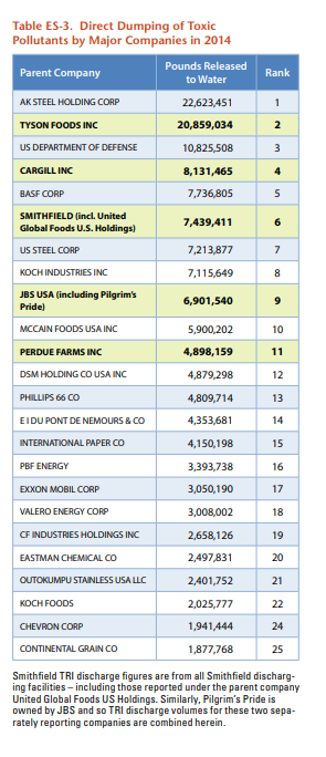 From slaughtering plants run by the company or its subsidiaries, Tyson discharged over 20 million pounds of toxic pollutants to the nation’s waters in 2014 — more by volume than even Exxon Mobil or Dupont — according to data the company reported to the federal Toxics Release Inventory. Most of the company’s toxic discharges are nitrates, which are linked to blue baby syndrome and some forms of cancer.