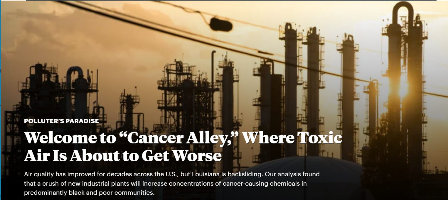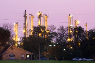 [Photo: Cancer Alley stretches 85 miles from New Orleans to Baton Rouge, where a dense concentration of oil refineries, petrochemical plants, and other chemical industries reside alongside suburban homes.Credit:Giles Clarke/Getty Images]