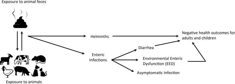 Humans can be exposed to pathogens from poorly managed animal feces, particularly in communities where animals live in close proximity to humans. This systematic review of peer-reviewed and gray literature examines the human health impacts of exposure to poorly managed animal feces transmitted via water, sanitation, and hygiene (WASH)-related pathways in low- and middle-income countries, where household livestock, small-scale animal operations, and free-roaming animals are common. We identify routes of contamination by animal feces, control measures to reduce human exposure, and propose research priorities for further inquiry. Exposure to animal feces has been associated with diarrhea, soil-transmitted helminth infection, trachoma, environmental enteric dysfunction, and growth faltering. Few studies have evaluated control measures, but interventions include reducing cohabitation with animals, provision of animal feces scoops, controlling animal movement, creating safe child spaces, improving veterinary care, and hygiene promotion. Future research should evaluate: behaviors related to points of contact with animal feces; animal fecal contamination of food; cultural behaviors of animal fecal management; acute and chronic health risks associated with exposure to animal feces; and factors influencing concentrations and shedding rates of pathogens originating from animal feces.