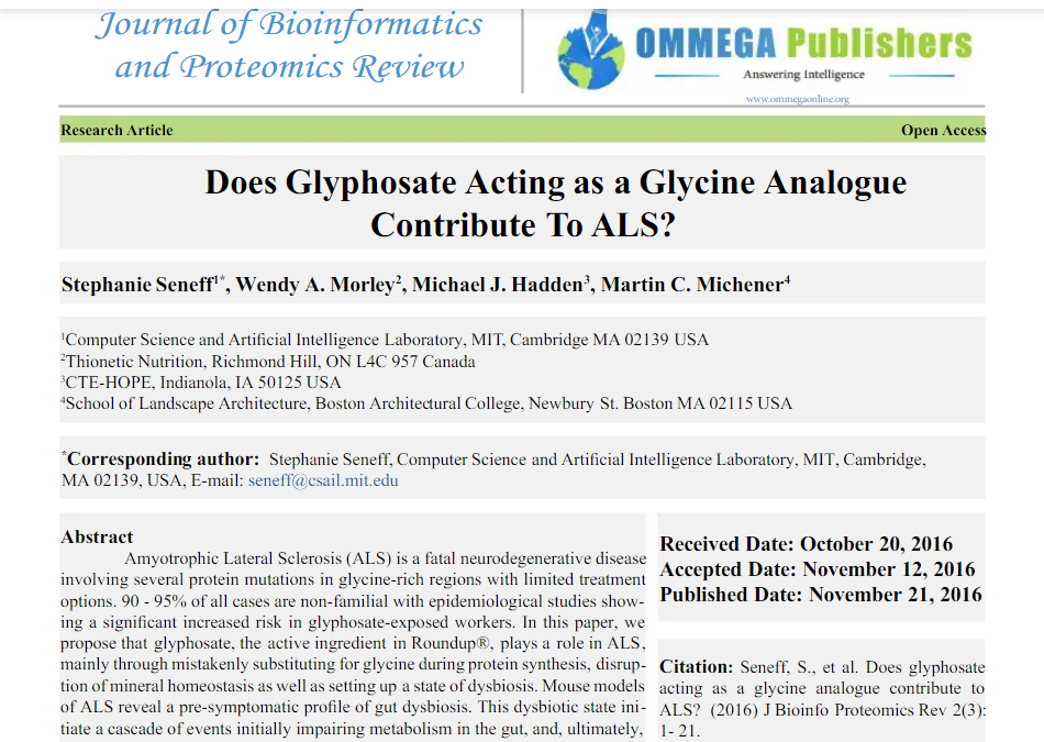 Amyotrophic Lateral Sclerosis (ALS) is a fatal neurodegenerative disease involving several protein mutations in glycine-rich regions with limited treatment options. 90-95% of all cases are non-familial with epidemiological studies showing a significant increased risk in glyphosate-exposed workers. In this paper, we propose that glyphosate, the active ingredient in Roundup®, plays a role in ALS, mainly through mistakenly substituting for glycine during protein synthesis, disruption of mineral homeostasis as well as setting up a state of dysbiosis.