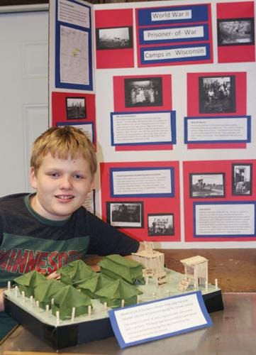 [Ian Krance, a Riverview Middle School student and the son of Ann and John Krance, Barron, displays the three-dimensional model of the German POW camp in Barron during WWII, which he built while he was in 4th grade. The history display was on exhibit during summer 2014 at Pioneer Village (the Barron County Historical Museum), between Barron & Cameron.]