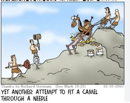 Jesus’ answer is the basis of the gospel: “With man this is impossible, but not with God; all things are possible with God” (Matthew 19:26). Men are saved through God’s gifts of grace, mercy, and faith (Ephesians 2:8-9). Nothing we do earns salvation for us. It is the poor in spirit who inherit the kingdom of God (Matthew 5:3), those who recognize their spiritual poverty and their utter inability to do anything to justify themselves to a holy God. The rich man so often is blind to his spiritual poverty because he is proud of his accomplishments and has contented himself with his wealth. He is as likely to humble himself before God as a camel is to crawl through the eye of a needle.