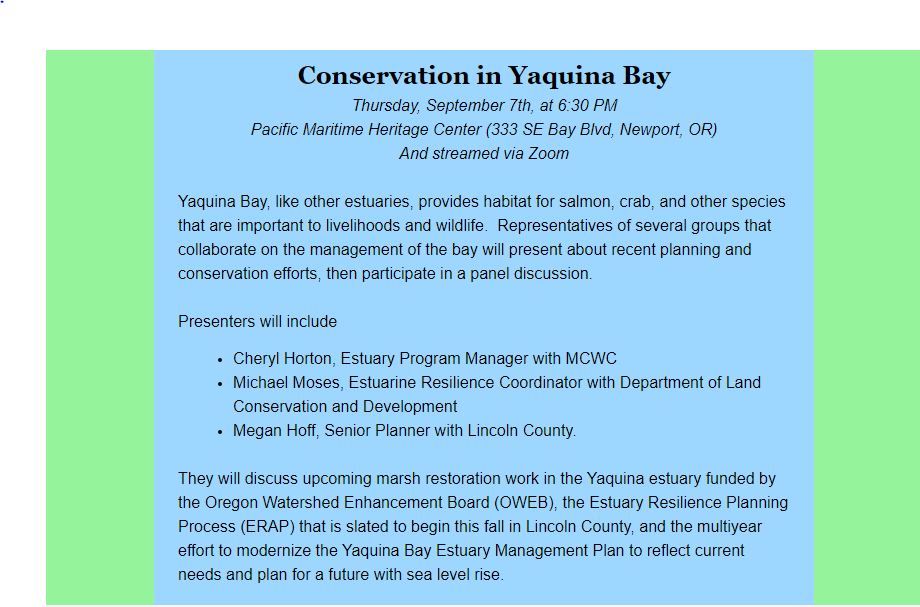 I was attempting to do this in person, this meeting of the Mid-Coast Watershed Council [read: “Fish Do Grow on Trees” ], but my bridge across one of these estuaries was clogged from the death of a motorcyclist who was hit head on by a truck. I turned around since the meeting would have been a bit of a stretch getting there on time.