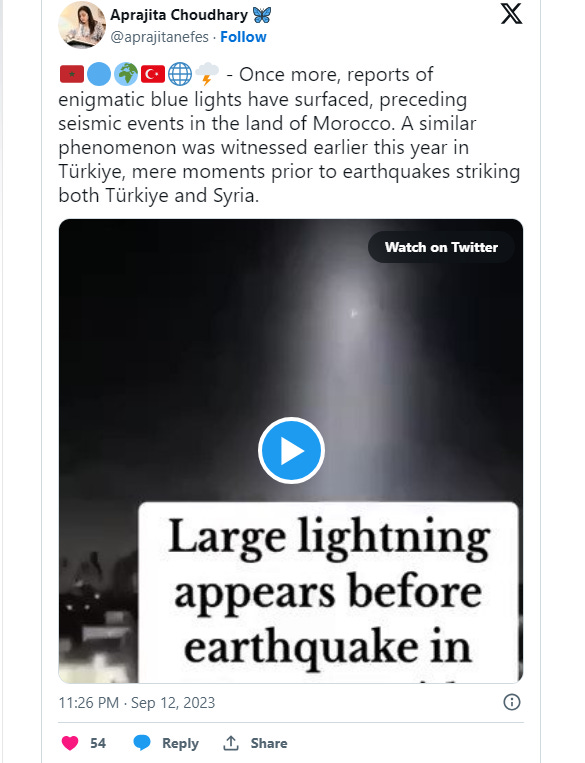 “Once more, reports of enigmatic blue lights have surfaced, preceding seismic events in the land of Morocco. A similar phenomenon was witnessed earlier this year in Turkey, mere moments prior to earthquakes striking both Turkey and Syria.”