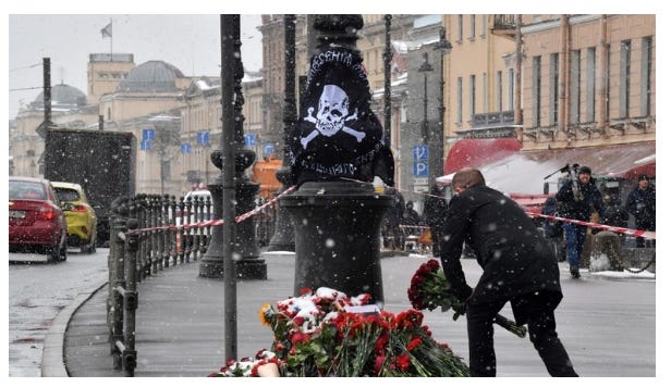 [Photo: A man lays flowers at a memorial for Russian military blogger Vladlen Tatarsky, who was killed in a bomb attack in Saint Petersburg.]