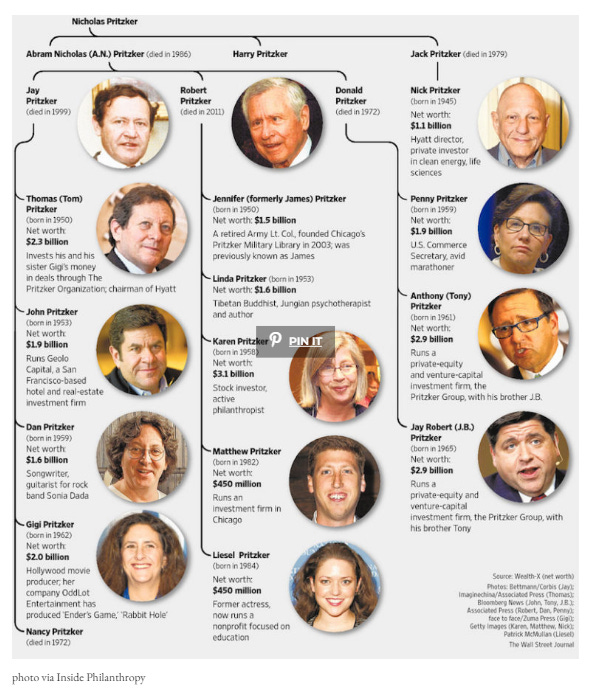 “Growing up was kind of like having Chuck Yeager and John Glenn for a dad,” said John, now 49 and an entrepreneur in San Francisco. And then Tom, Jay’s oldest son, stood up to speak. It was Tom, now 52, to whom Jay had passed the torch; Tom controlled the family’s empire—including its crown jewel, the Hyatt Hotels Corp., the Pritzkers’ web of more than 200 privately held companies, vast tracts of real estate, and some 1,000 family trusts, all of which, taken together, are said to be worth $15 billion, if not more. His father, Tom told the crowd, “believed a man’s only immortality comes from the values he instilled in his children. The country has lost a great man. I’ve lost my father. I’ve lost my partner. I’ve lost my best friend.” As he spoke, Tom began to cry. (source)
