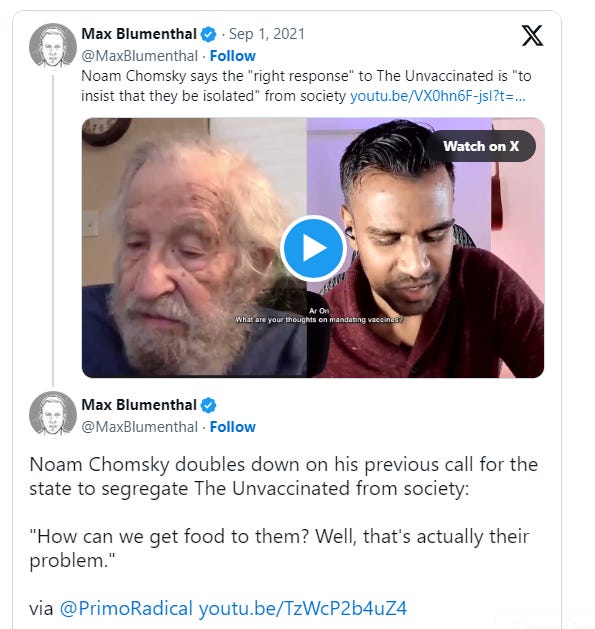 CNN’s Don Lemon commented that people refusing the vaccines were being “idiotic and nonsensical.” He argued that it was time to “start shaming them” or “leave them behind.” Noam Chomsky, a self-described libertarian socialist, said unvaccinated people should remove themselves from society and be “isolated.” Asked how they would get food that way, he answered, “Well actually, that’s their problem.”