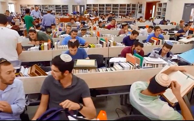 [Photo: Students at the Bnei David pre-army academy learn in the study hall. (Screen capture/YouTube)]