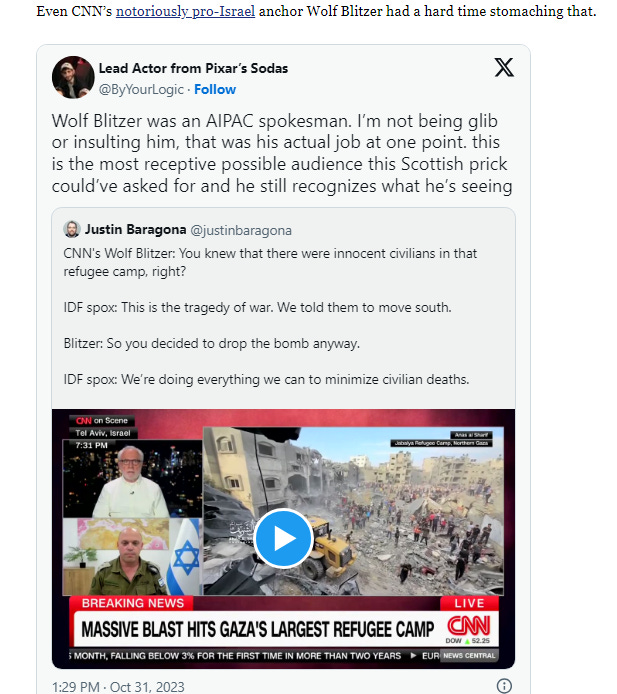 Instead, he proposed that “moderate Arab countries could come together and promote some sort of stability” in a post-holocaust Gaza. There would “have to be some sort of moderate Arab coalition which could produce some moderate Palestinians who were willing to work with Israel.”