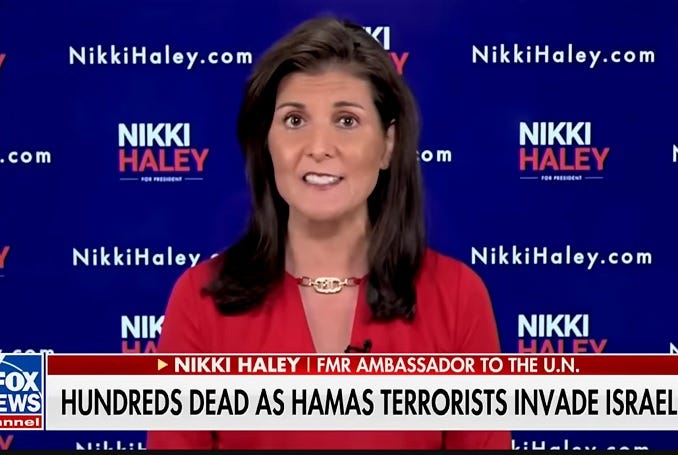 So am I getting a call from the Felony Bureau of Incompetence, FBI, if I call for the obliteration of all politicians and all people calling for “finish them … finish them”? Former U.N. Ambassador NIKKI HALEY, who’s running for the 2024 GOP presidential nomination, said on Fox News this morning: