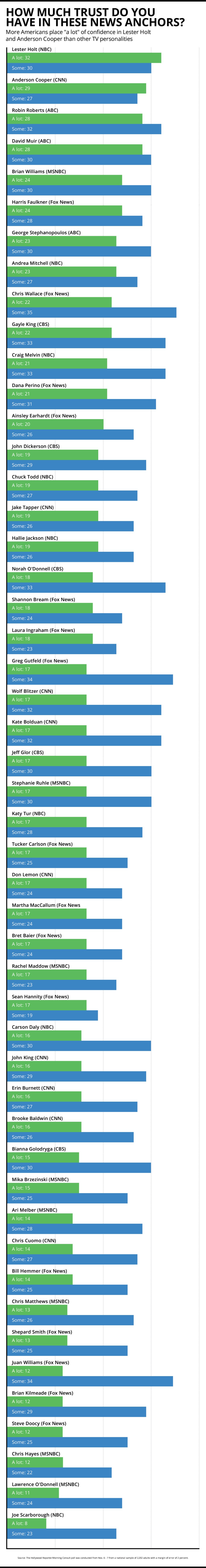 Trust is distinct from likability, which television networks monitor through what’s known as a “Q Score.” According to the survey, 69 percent of respondents say that likability is a “very” or “somewhat important” factor when deciding where to watch news about politics, while only 23 percent say it’s not important. “I think credibility is what matters for news,” Feinstein says. “I don’t think likability matters much at all.”