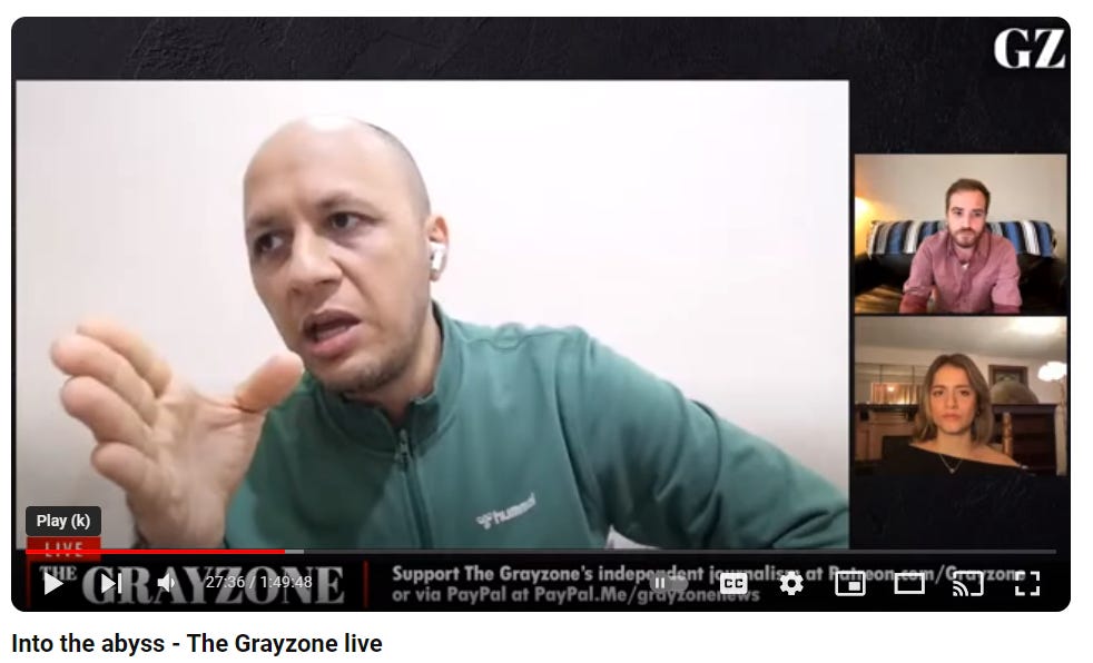 Sure, we can take Grayzone once in a while, and here (above), a real Gazan talking real about the murder of his family. LINK. [Let me explain why I have to put in LINK with the actual hot link. These shows have been messed with by YouTube so the real video and audio capture, the actual screen, will not come through like those above. Instead, we get just the url: https://www.youtube.com/live/TP2ime7zxQc?si=4-urX0U1eBHZNtGW — go to 55 minutes and see the cool, calm collected freak of BIPOC shit hole answer Blumenthal!]