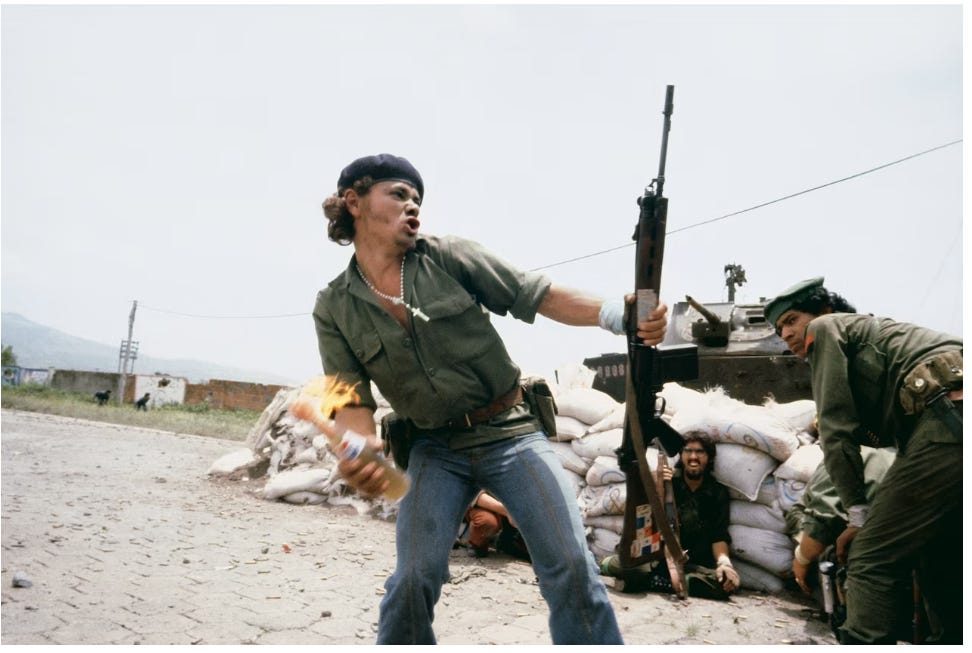 A member of the Sandinastas throws a Molotov cocktail at National Guard headquarters in Esteli, Nicaragua, in 1979. The photograph has become known as Molotov Man. PHOTOGRAPH BY SUSAN MEISELAS!