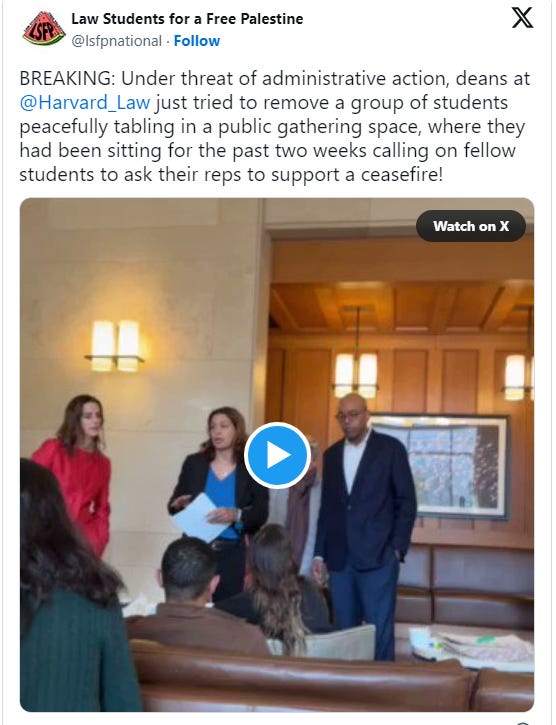 Responding to the incident, Law Students for a Free Palestine, an organization of students from 38 law schools across the country, released a statement that alleged Harvard students had been “uniquely targeted by repression.”